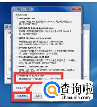 这个地方需要区分一下,根据你的实际情况来选择。旧版本的bootice软件的情况,电脑系统为XP的选择nt5.x,电脑系统为Win7的选择nt6.x;新版的bootice软件的情况,就不用管电脑是什么系统的,nt5.x和nt6.x混在一起,统一选择一项即可。选择完成后,点击【安装/配置】即可。