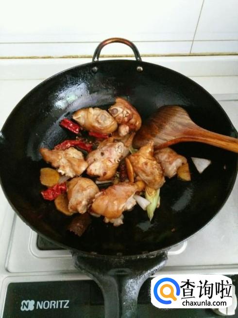 炒好糖色后,就可以倒入猪蹄,生姜片,大葱段,干辣椒翻炒了。
