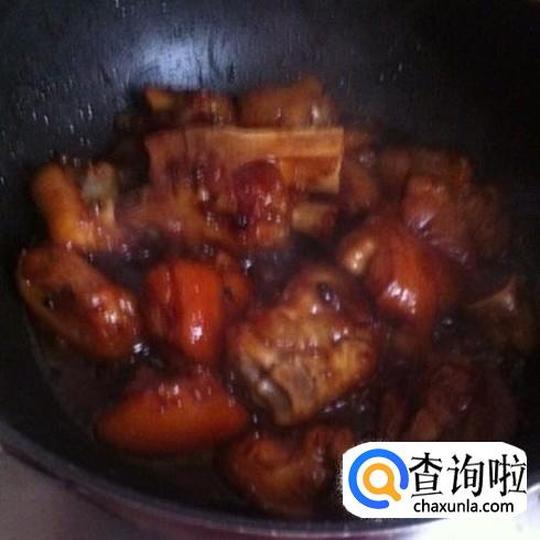 翻炒到猪蹄上沾有糖色后,加入生抽和老抽 继续翻炒,直到猪蹄的颜色变深 就可以加水了