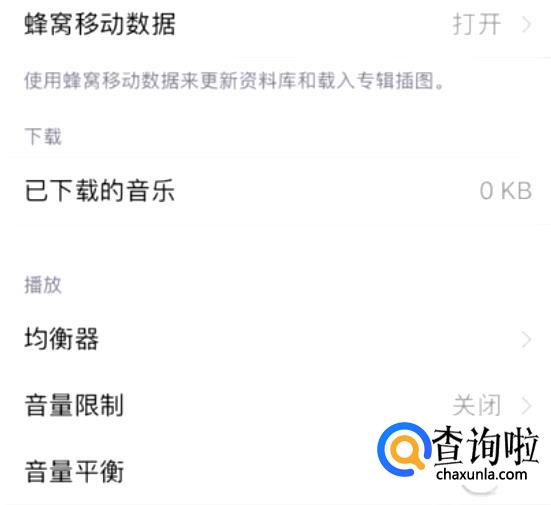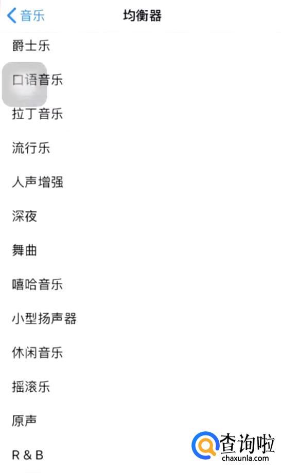 在音乐选项中找到“均衡器”,将均衡器模式改为“深夜”。