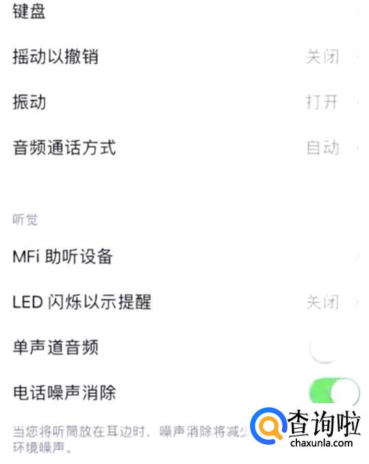 然后往下滑找到并打开“单声道音频”,“电话噪声消除”。