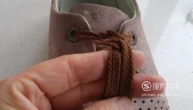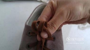 然后将两条鞋带用左手的拇指、食指和中指固定住鞋带的游离部分,