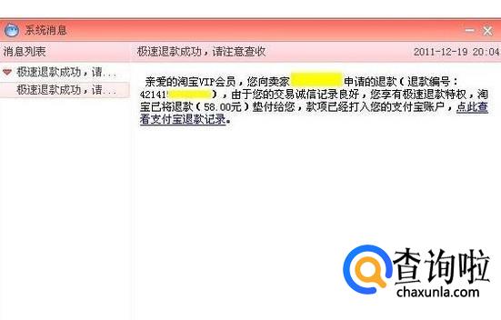 此时,出来一个系统消息,写着由于您交易诚信记录良好,您享有极速退款特权,淘宝已将退款垫付给您,款项已经打入您的支付宝账户。这时,只要点开支付宝,就能看到已经退回来的款项了。