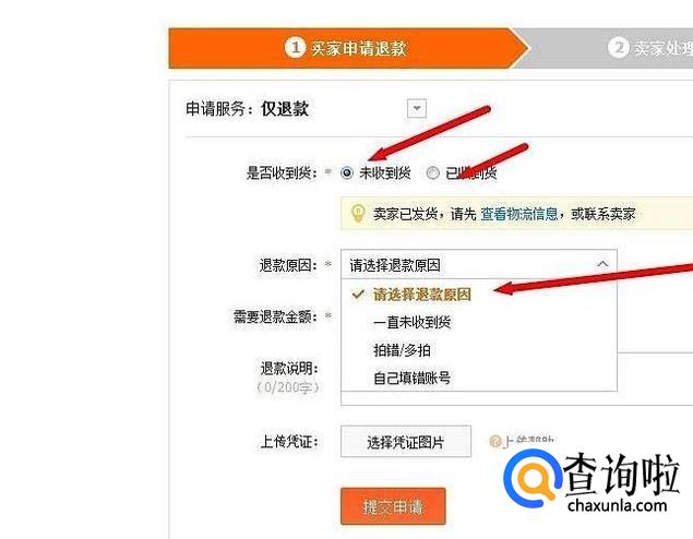在接下来的申请退款页面中,在是否收到货一项,选择未收到货,在下面的退款原因中,也选择一直未收到货,然后写上退款金额和退款说明,如果有图片证据的,可以上传图片。然后点击提交申请按钮。