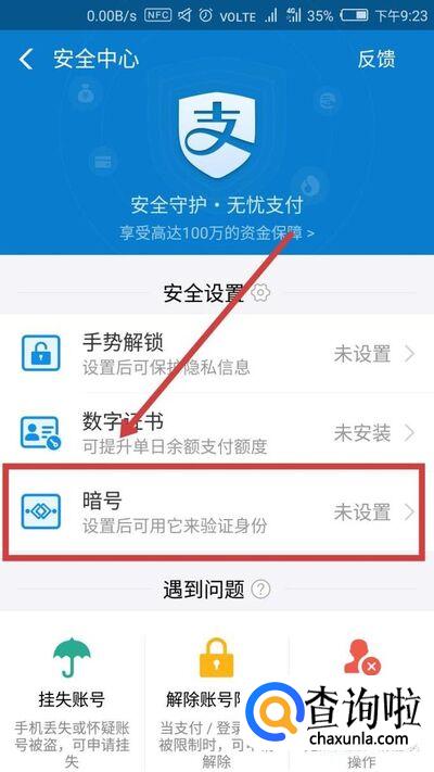进入到“安全中心”界面,在界面重要找到“暗号”,点击进入即可设置。