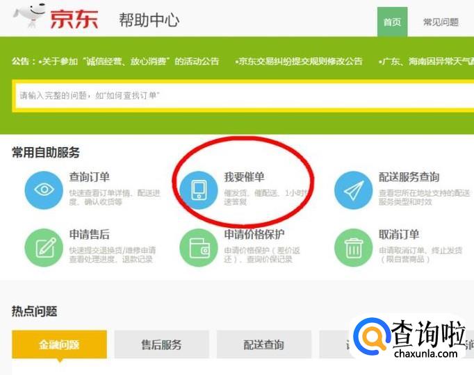 进入“帮助中心”后,可以看到“我要催单”的服务,点击进入