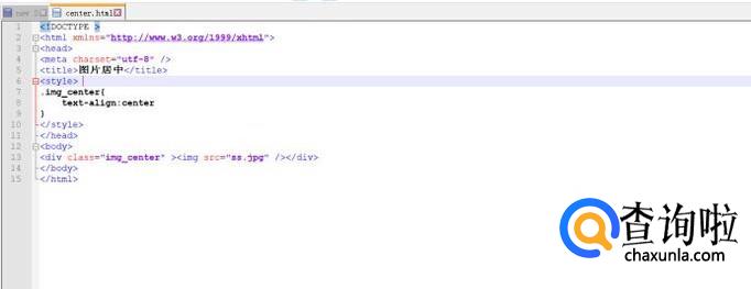 我们还可以通过样式文件来实现图片的居中显示,这里我们以class选择器为例,为图片层加入class="img_center",然后在style标签中定义样式,如下图