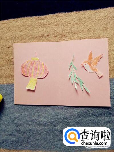 把灯笼粘在彩纸的左半边,只粘灯笼中间的部分,四周翘起来更有立体感。