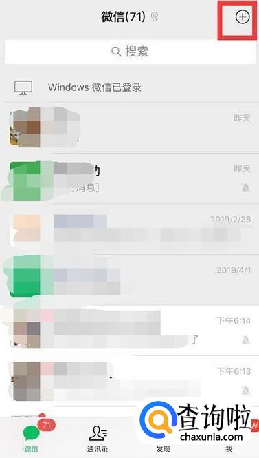 然后打开微信,点击左上角+这个符号。