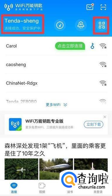 wifi万能钥匙如果要查看密码,首先点击钥匙,点击加入,连接成功后,点击四叶草标志,接着把带有二维码的图片保存在手机相册里,接着打开微信,点击右上角+这个符号,再点击扫一扫,然后点击相册,找到保存的二维码图片,扫描后即可看到密码。