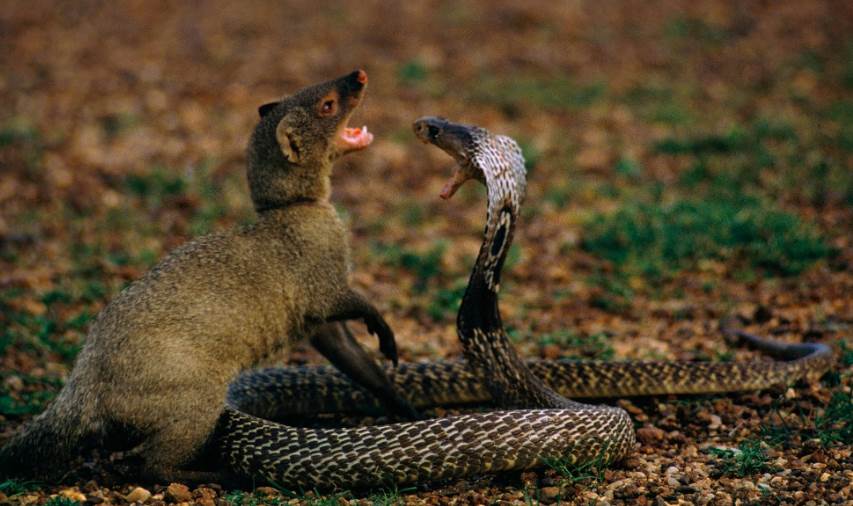 蛇獴别称蒙哥、灰獴等,身体灵活,多栖息于热带丛林中,捕食小动物,亦食眼镜蛇,对蛇毒具强抗性。而且,蛇獴活在世界上就好像专门和毒蛇作对头,有时蛇獴吃饱了胃里放不下了,但是遇到毒蛇还是要把它咬死,好像猫见了老鼠那样毫不留情。