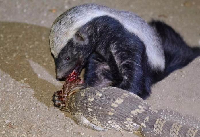 蜜獾的皮毛都非常粗糙,既不怕蜂蜇,也不会怕蛇咬,特别喜欢吃蜂蜜,另外也很喜欢吃蛇,一看到蛇就会主动进攻,眼镜王蛇、曼巴蛇这样的剧毒蛇类都是其食物。具有高敏捷性和天生的抗毒体质,毒蛇咬了以后可以完全无感,最多就是躺下睡一会又可以起来活蹦乱跳了,所以蛇对它无解。