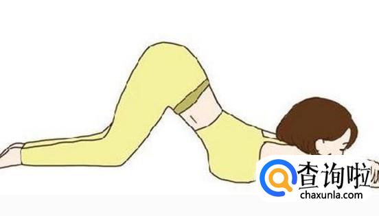 猫伸展式,双手撑在床上,双膝跪在床上,保持这个姿势,然后吸气时,背部下沉,抬头;呼气时,背部拱起,将头低下;这个动作一定要配合呼吸,每次5组。