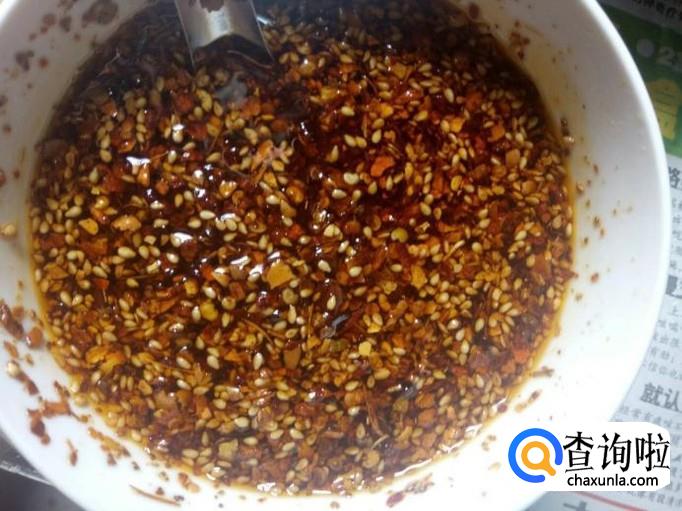 拿一个小碗,放入辣椒面、白芝麻和少量的盐,用烧热的油浇上去,做成辣椒油,备用。