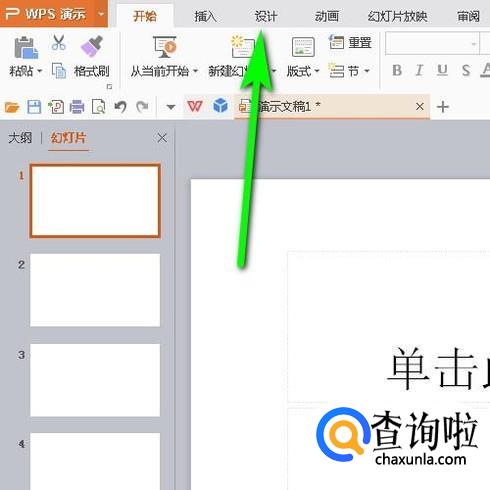 选中最上面的幻灯片,鼠标再点菜单栏中的“设计”选项卡。