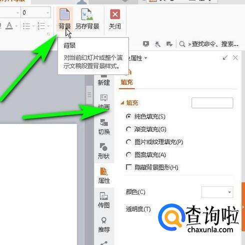 鼠标点击菜单栏中的背景,右侧弹出设置背景的窗口,从中按自己的想法设置母版的背景。比如,我设置了背景为渐变色。接着,把窗口关闭。