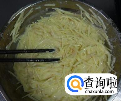 将土豆丝、葱、盐放入盆中,和面糊一起搅拌均匀。