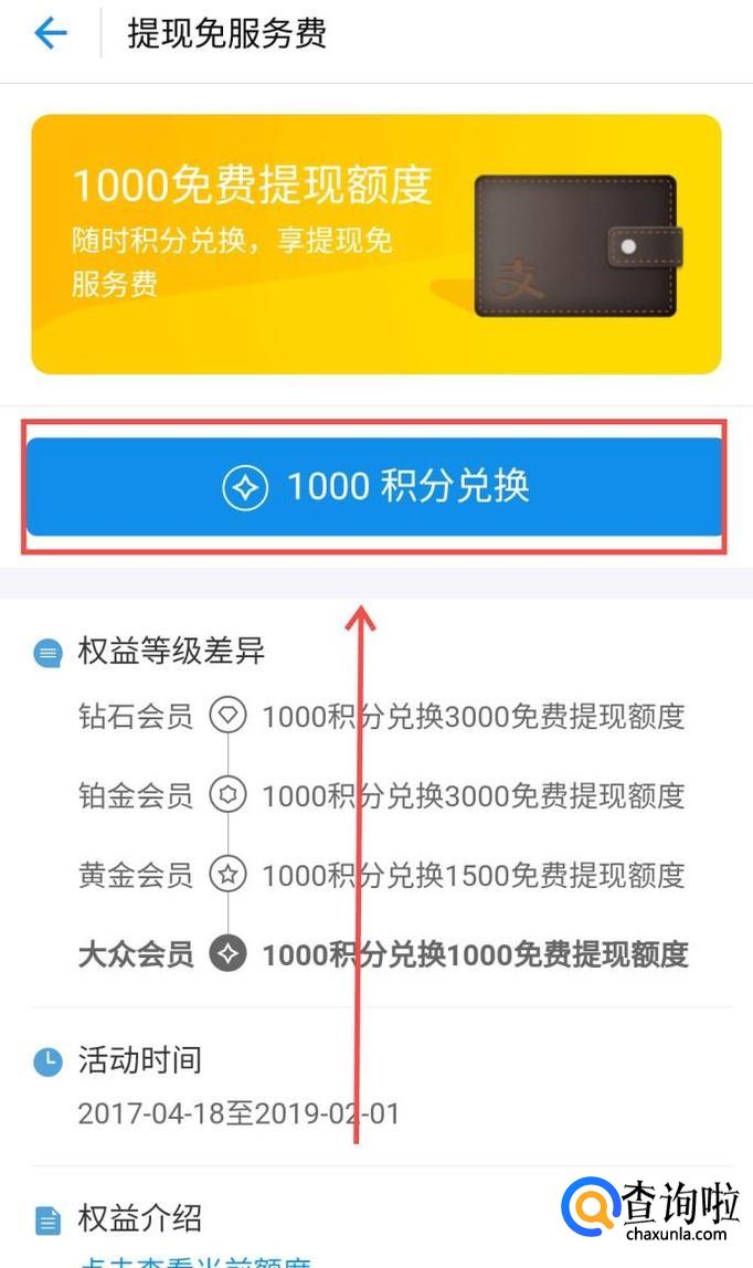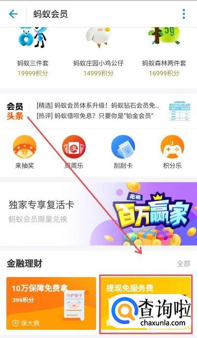 这里我以“提现免服务费”为例,介绍蚂蚁积分的使用方法。找到“提现免服务费”,点击进入。