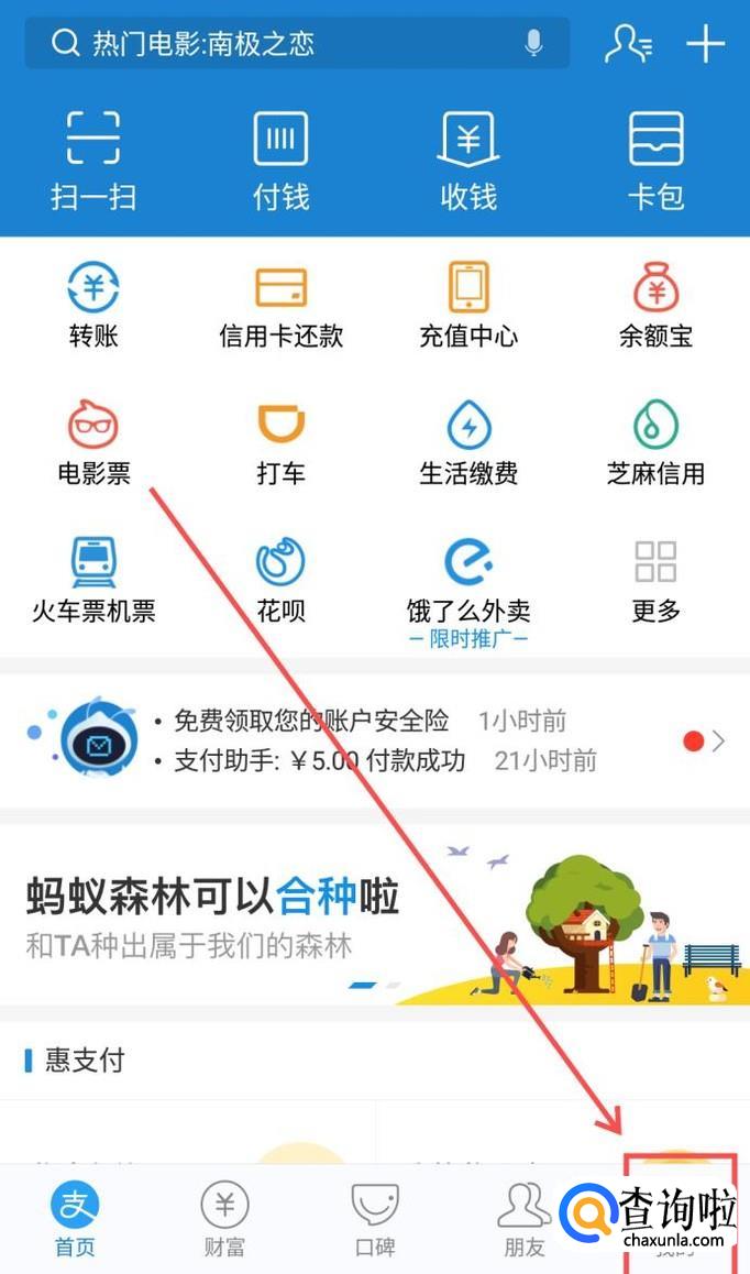 打开支付宝,在页面右下角找到“我的”,点击进入。