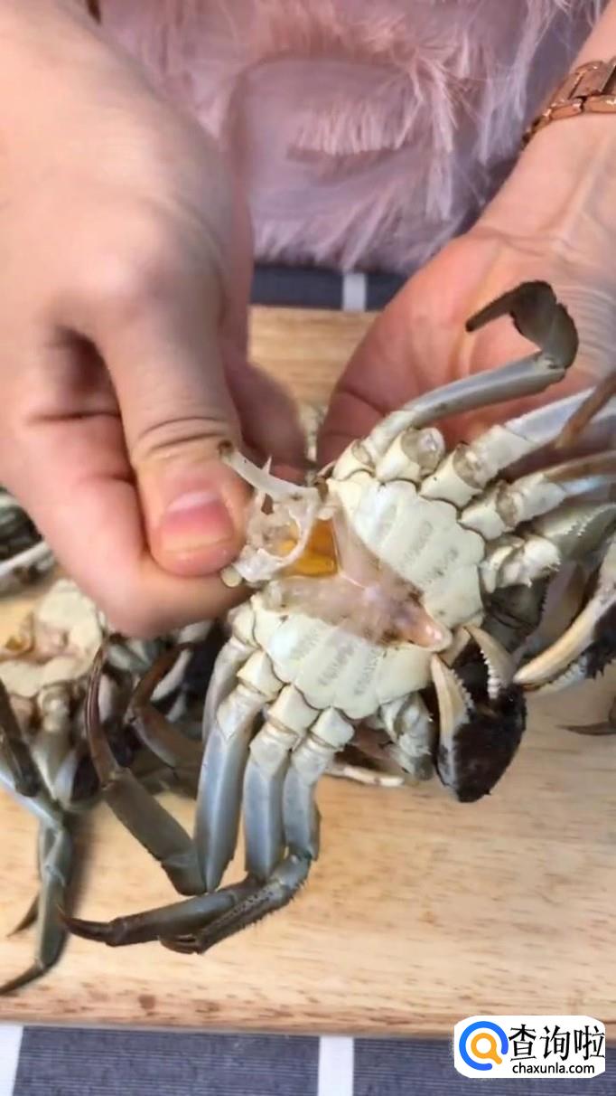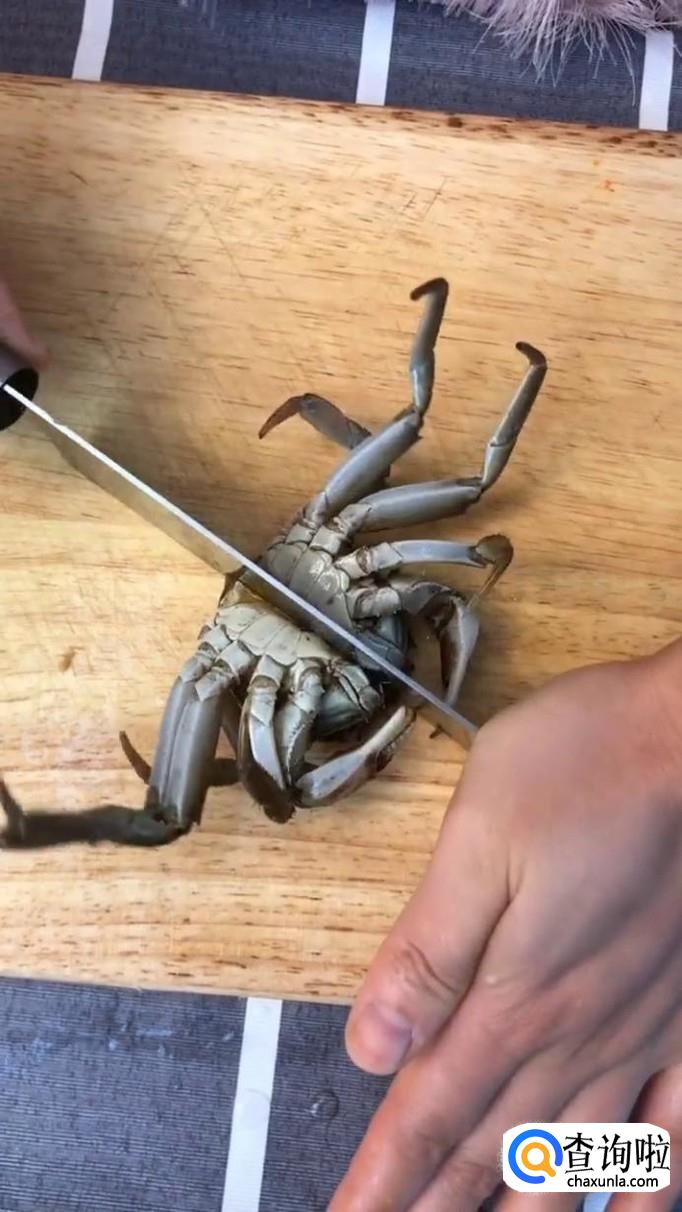 首先将螃蟹清理干净并用刀对半切开,如下图所示。