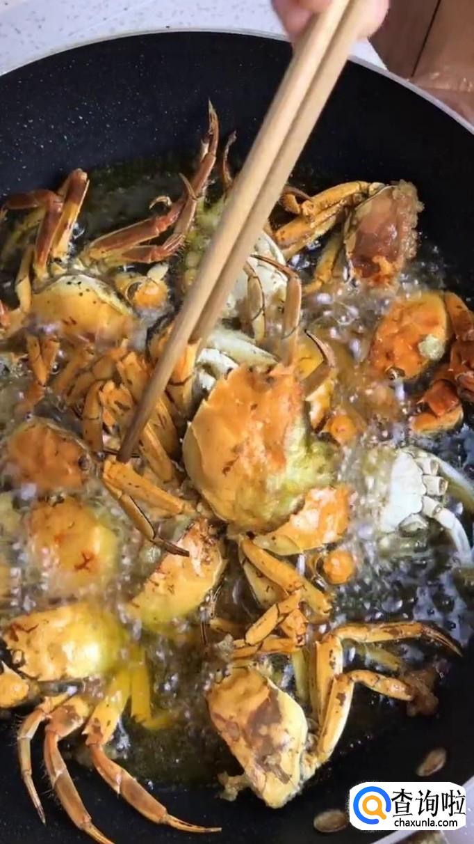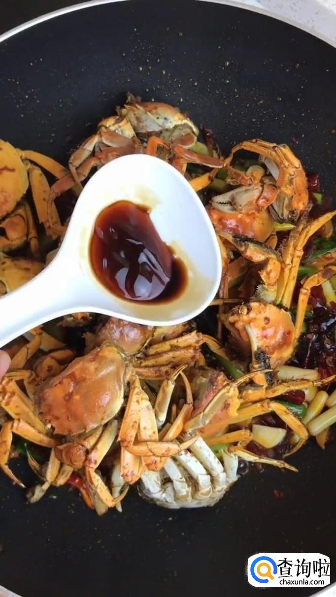 接着把炸好的螃蟹倒入锅中并加入适量的生抽,翻炒两分钟,如下图所示。