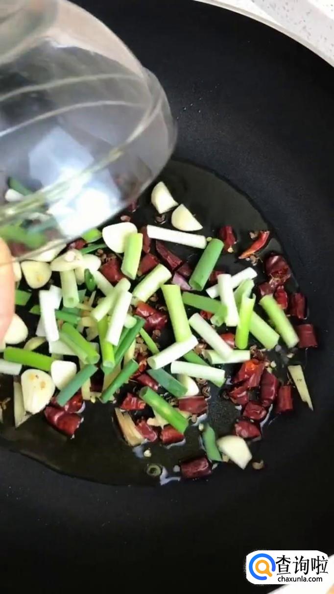 接着往锅中加入适量的食用油,倒入蒜段、辣椒、蒜头爆香,如下图所示。