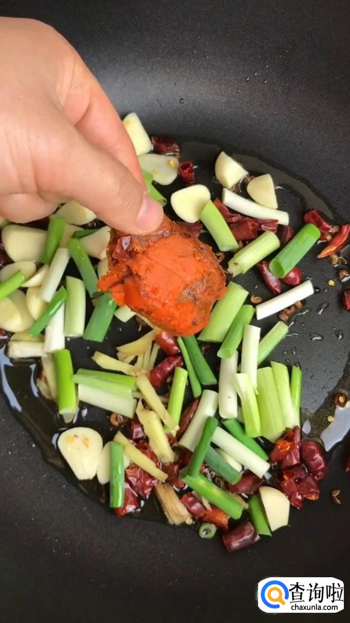 然后管锅中放入适量的火锅底料,翻炒两分钟。