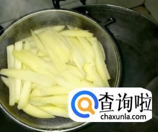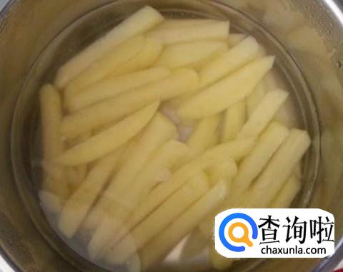 在锅中放入清水,烧开,将土豆条放入锅中,煮到八分熟,用漏勺控干水分,可以放入冰箱稍微冻一下,使土豆条更硬,不易折断。