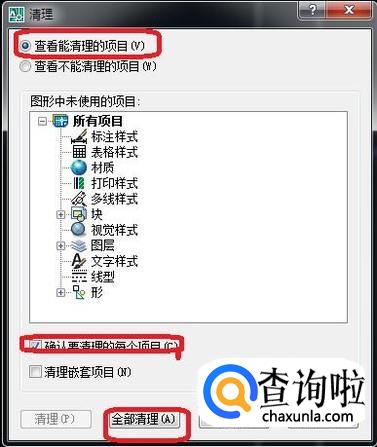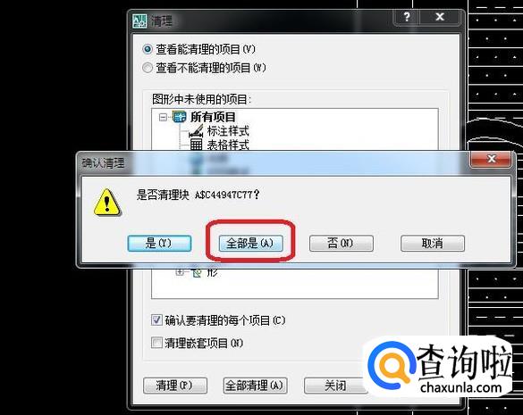 出现提示,是否清理,选择“全部是”,清理完成之后,保存图形,就会发现文件变小了很多。