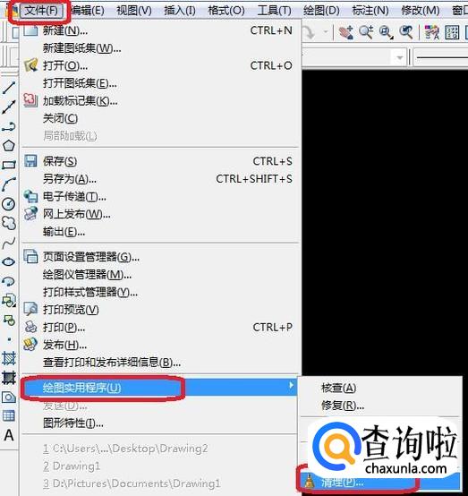 点击“文件”,下拉菜单中选择“绘图实用程序”,选择“清理”。