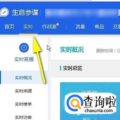 在页面上方的蓝色部位,一横排内容是导航栏。我们想要看哪方面的数据就点击哪一项。比如,你想要看店铺实时数据。那么,就点击:实时
