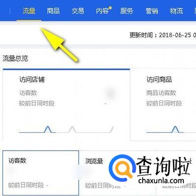 比如,你想看流量数据,那么,在导航栏这里点击“流量”;转到“流量”数据页面;在这里你可以很清楚的看到你店铺首页的访客量,以及商品访客量。