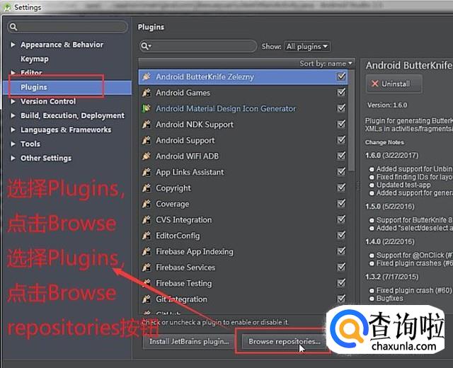 在弹出的界面中选择左侧的Plugins选项,点击底部的Browsr repositories按钮,如下图所示
