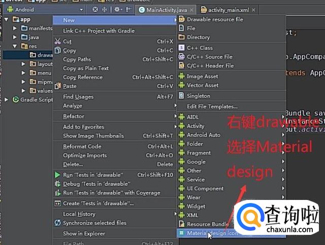接下来右键单击drawable选项,在下拉菜单中选择Material design选项,如下图所示