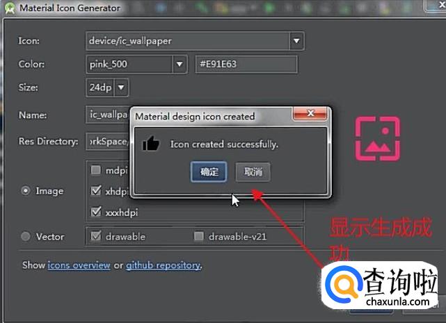 接下来点击OK按钮,如果提示如下图所示的界面则代表生成图标成功