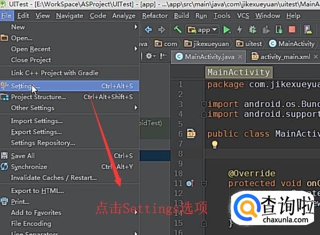 打开Android Studio软件,点击顶部的File菜单,选择Settings选项,如下图所示