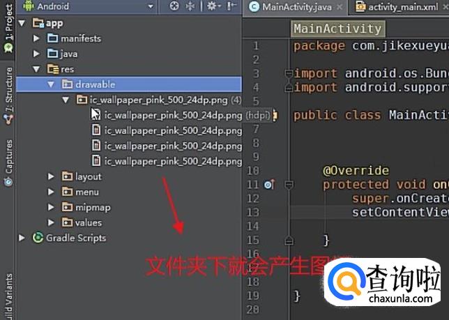 最后回到Android Studio主界面,我们就可以看到drawable文件夹下面就已经生成了图标了,如下图所示
