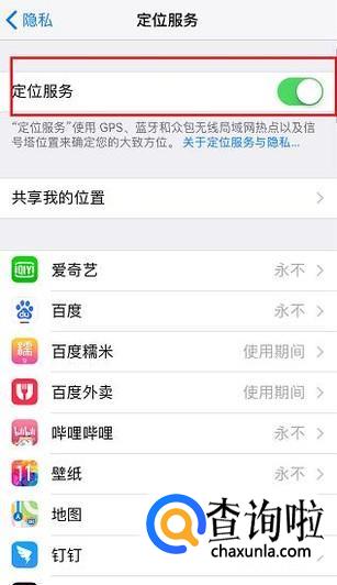 关闭“定位服务”对应的开关选项,即可使手机在任何情况下,都不会使用“定位服务”这一功能。