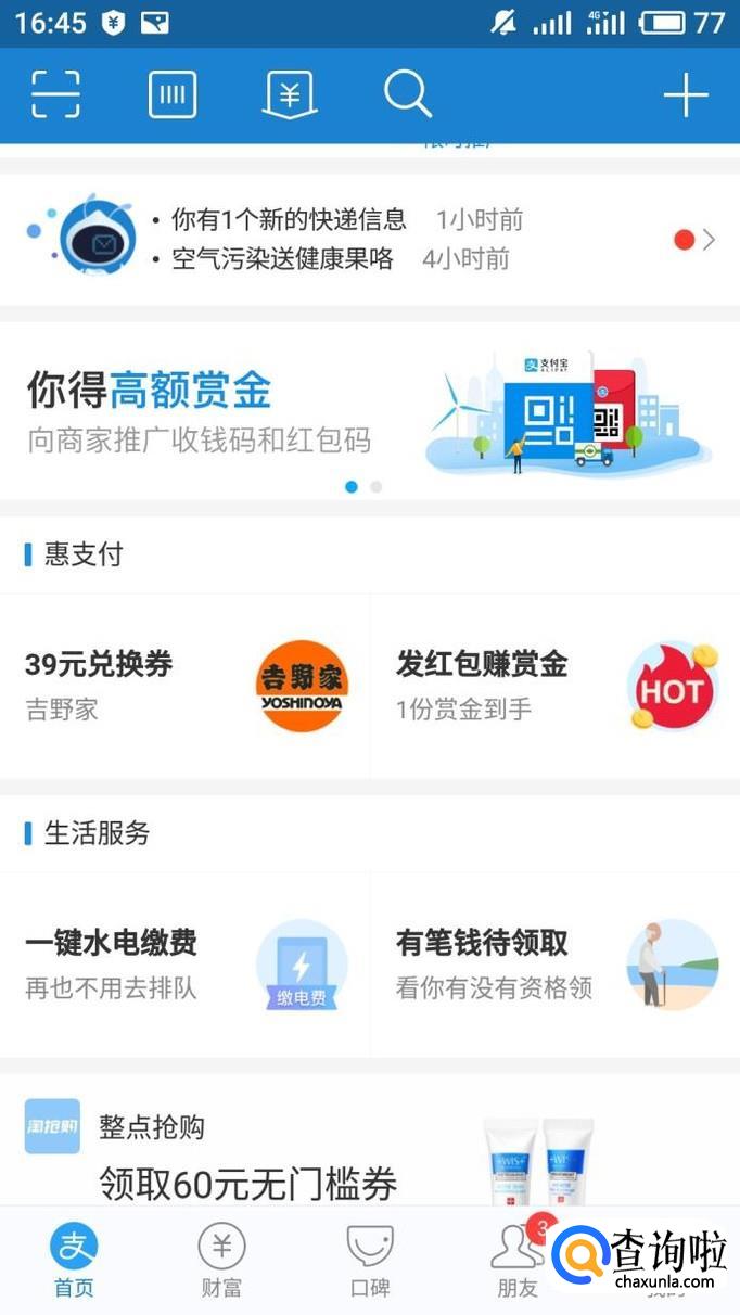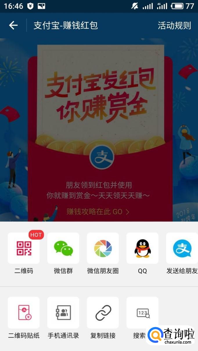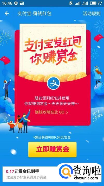 打开支付宝进入首页后找到发红包赚赏金,连接就在首页仔细的找一下。