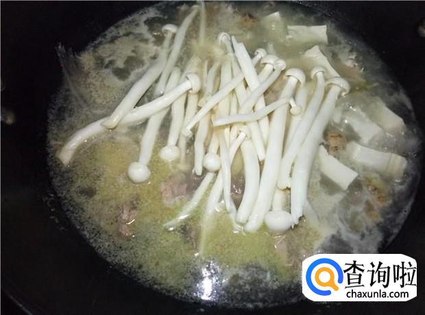 把鱼汤给煮开后,再加入海鲜菇,再盖上锅盖大火炖。