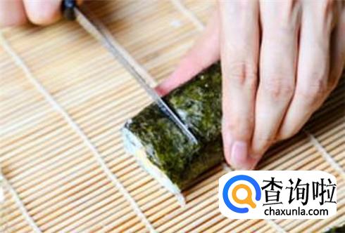 将食材全部放好之后,将海苔正片的卷起来,然后用寿司帘紧紧的包裹住,用力握紧之后松开,将寿司切开就行了。