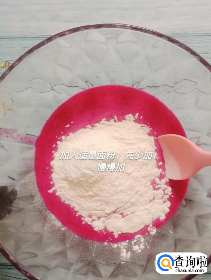 然后在火龙果汁中加入适量的面粉,如下图所示。