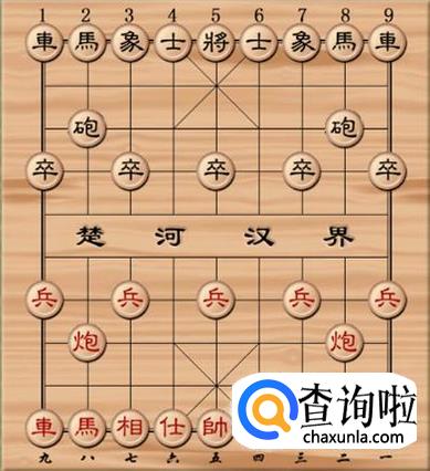棋盘以楚河汉界分为两部分,一半为红棋,另一半为黑棋。