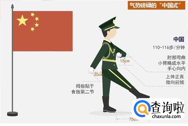 手指轻轻握拢,拇指伸直贴于食指第二节,向前摆臂时,肘部弯曲,小臂略成水平,手心向下,手腕下沿摆到高于最下方衣扣约10厘米处,离身体约10厘米,向后摆臂时(左手心向右,右手心向左),手腕前侧距裤缝向约30厘米。行进速度每分钟110-116步。