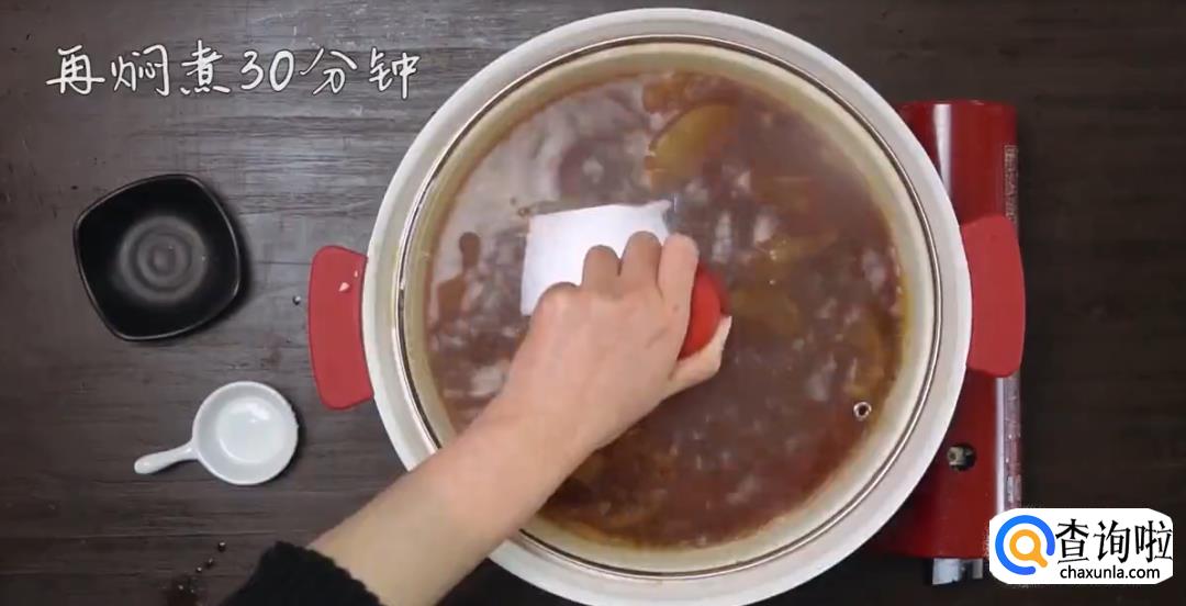 下盐巴,冰糖后再次盖盖子焖煮30分钟。