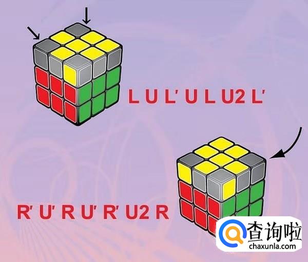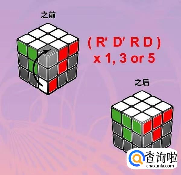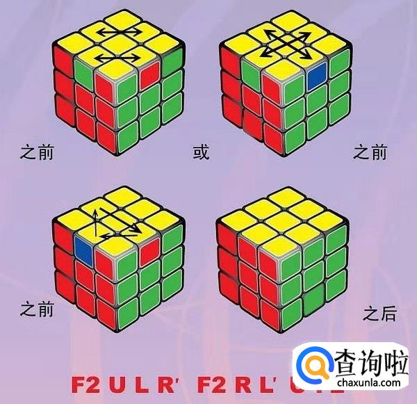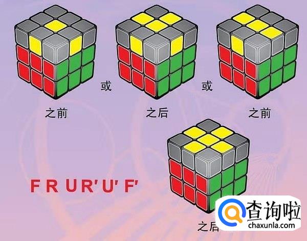 然后将顶层(应该是黄色)边块调整向上,做出黄十字。若按照口诀转动1次后,顶层仍未出现黄色十字,可重复按口诀转动,直到黄色十字出现为止。
