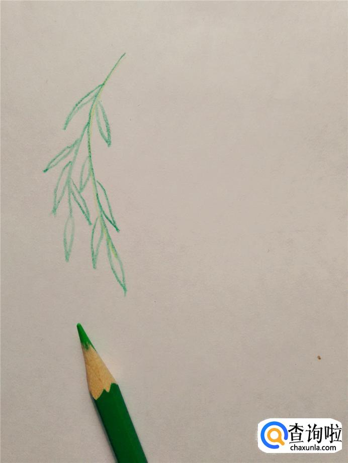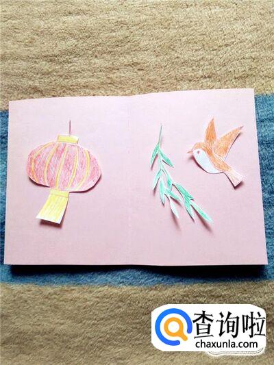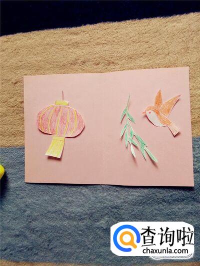 用同样的方法把小鸟和柳枝粘在彩纸的右半边,贺年卡就做好了。