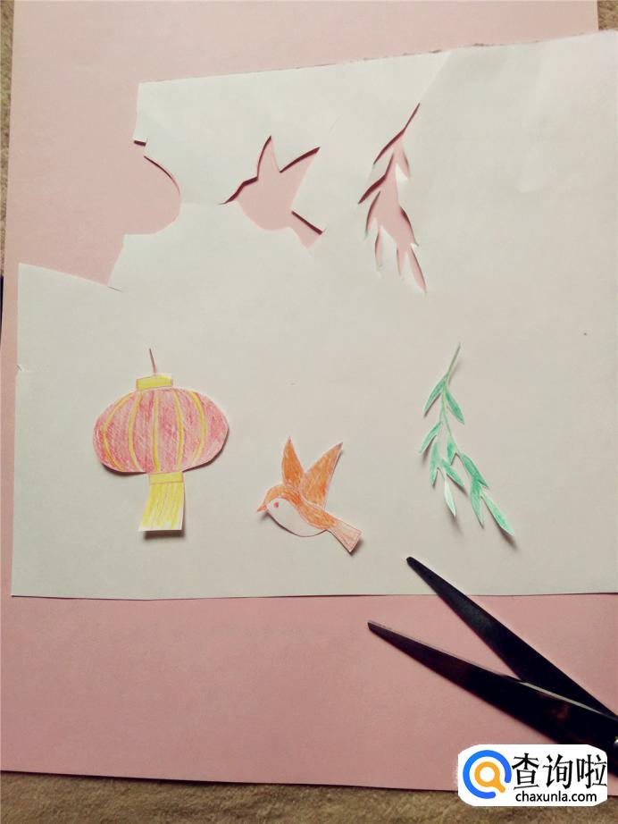 用剪刀把灯笼、小鸟、柳枝剪下来。