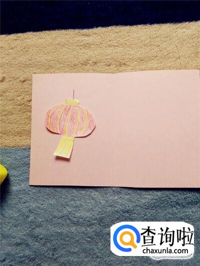 把灯笼粘在彩纸的左半边,只粘灯笼中间的部分,四周翘起来更有立体感。