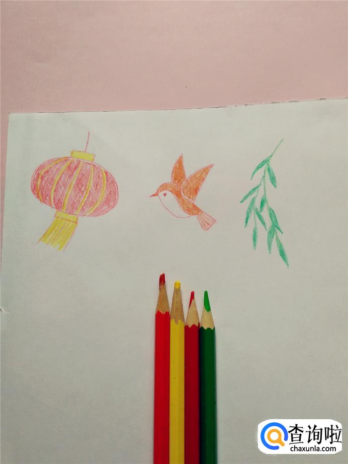 用彩笔把灯笼、小鸟、柳枝涂上颜色。